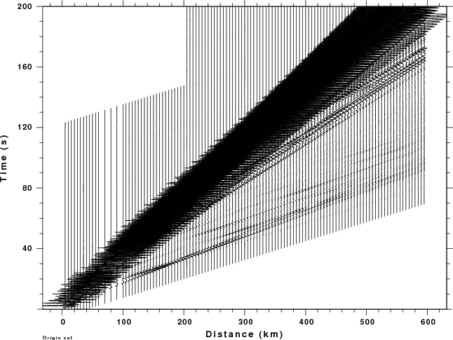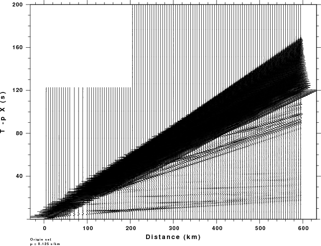 Another use of the reduction velocity is start the synthetic seismograms just before the first arrival, which is how the synthetics shown in the first figure were comptued. This technique saves a lot of computer time and gives nicer synthetics.