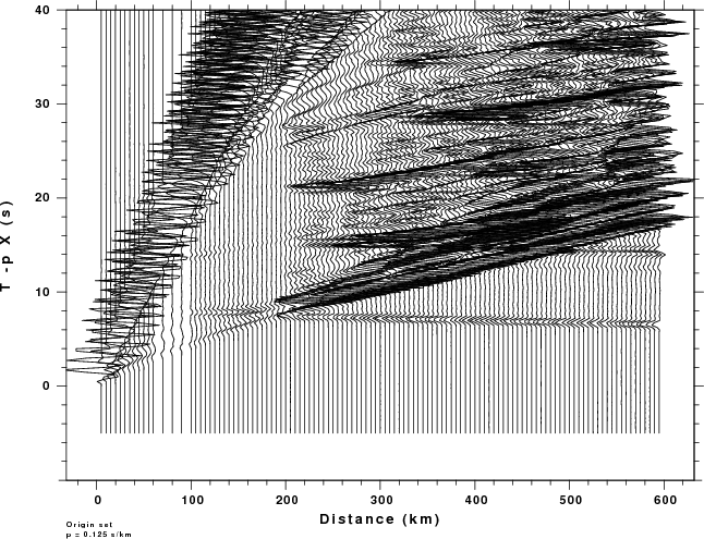 We now use a reducting velocity of 8 km/sec and plot the traces at 'reduced time' of t - 0.125 r where the ray parameter p= 0.125 = 1/8.0 sec/km. This is shown in the second figure.